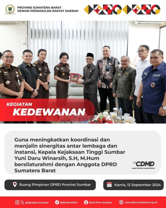 MMNews, Guna meningkatkan koordinasi dan menjalin sinergitas antar lembaga dan instansi, Kepala Kejaksaan Tinggi Sumbar (Kajati Sumbar), Yuni Daru Winarsih bersilaturahmi dengan Ketua sementara DPRD Sumatera Barat Irsyad Syafar, Kamis (12/9).