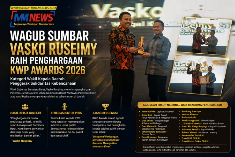 Wagub Sumbar Vasko Ruseimy Raih Penghargaan KWP Awards 2026, Tegaskan Ini Hasil Kerja Kolektif April 17, 2026 Tidak ada komentar Read More »