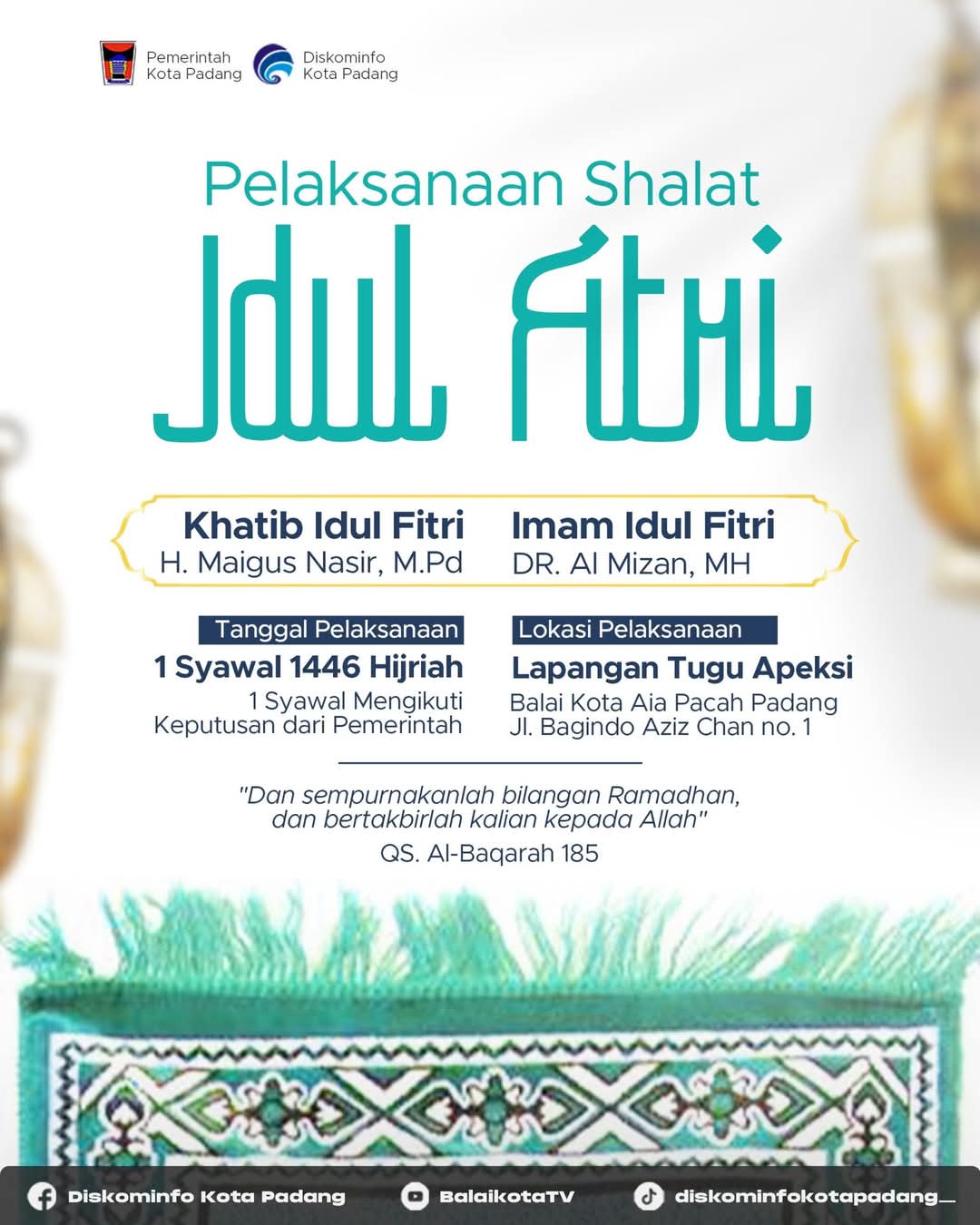 Padang – Wakil Wali Kota Padang, Maigus Nasir, akan bertindak sebagai khatib dalam pelaksanaan Salat Idulfitri 1446 Hijriah, sementara itu, Dr. Al-Mizan akan bertugas sebagai imam yang dijadwalkan berlangsung pada pukul 07.00 WIB yang digelar di kawasan Tugu Apeksi, Balai Kota Aia Pacah.