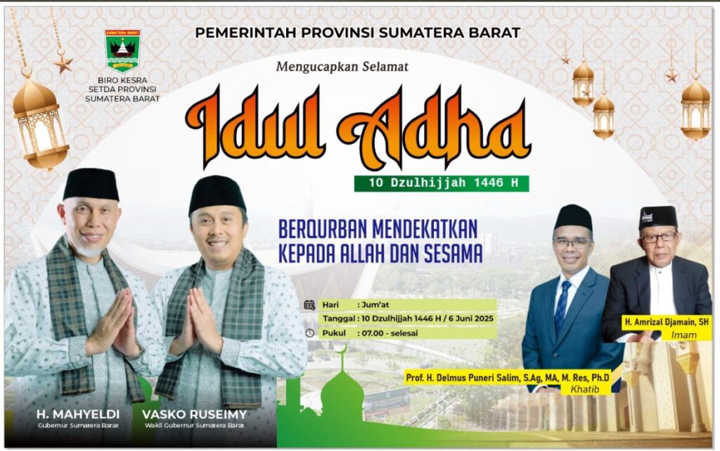 PADANG, MMNEWS – Pemerintah Provinsi Sumatera Barat (Pemprov Sumbar) akan kembali menggelar Shalat Idul Adha 1446 H /2025 M di halaman kantor Gubernur Sumbar, pada Jum’at (6/6) besok. Berbagai persiapan untuk menyukseskan itu pun sudah mulai dilakukan. Nantinya yang akan bertindak sebagai khatib adalah Prof Delmus Puneri Salim (Rektor UIN M. Yunus Batusangkar), sedangkan H. […]