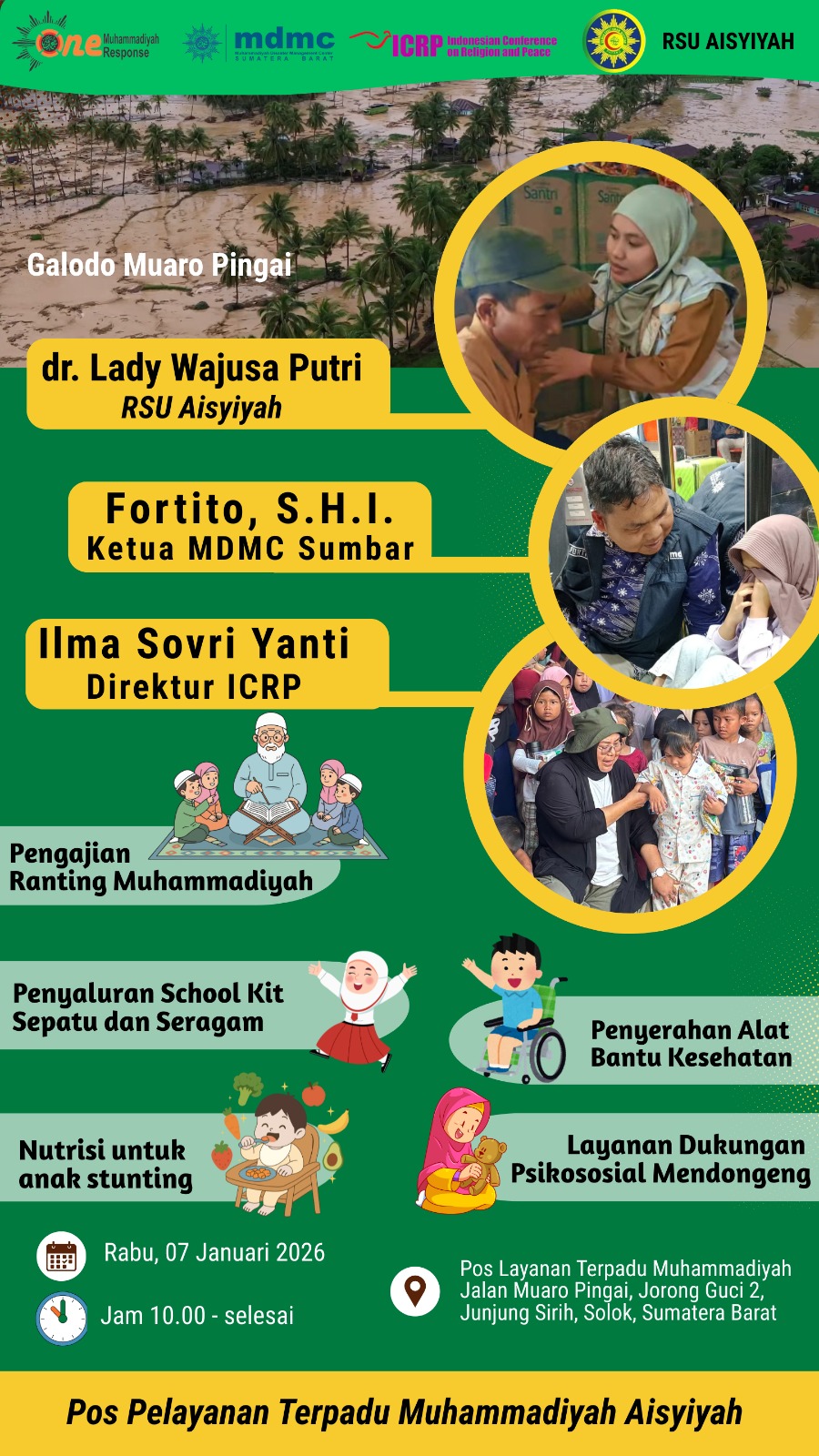 Solok — MDMC Pimpinan Wilayah Muhammadiyah (PWM) Sumatera Barat kembali menunjukkan komitmennya dalam kerja-kerja kemanusiaan pascabencana melalui kegiatan terpadu yang dilaksanakan di Nagari Muaro Pingai, Kabupaten Solok, Rabu (7/1/2026). Kegiatan yang berlangsung sejak pukul 08.00 hingga 18.00 WIB ini merupakan kolaborasi bersama ICRP, RS Aisyiyah Padang, Moeslem Disaster Rescue (MDR) MUI, serta Yayasan Ardi Santoso Indonesia.