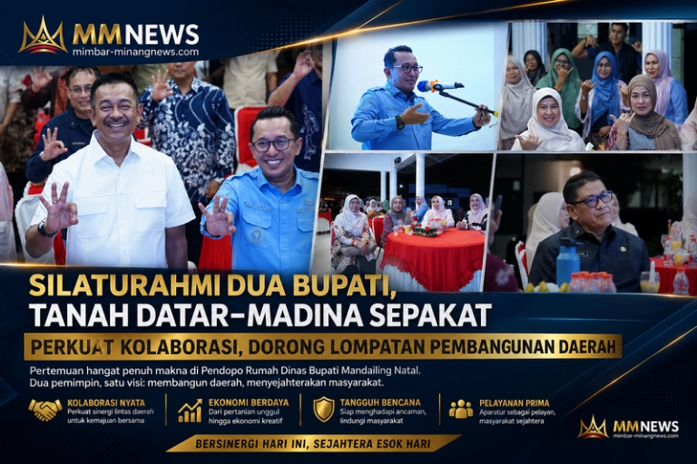 Madina, mimbar-minangnews.com — Pertemuan hangat penuh makna tersaji di Pendopo Rumah Dinas Bupati Mandailing Natal (Madina), Kamis (23/4/2026) malam. Dua kepala daerah—Bupati Mandailing Natal, H. Saipullah Nasution, dan Bupati Tanah Datar, Eka Putra—bertemu dalam agenda silaturahmi pembangunan yang sarat pesan kolaborasi dan percepatan kemajuan daerah.