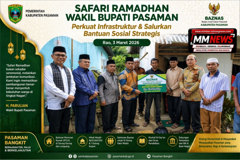 Pasaman, mimbar-minangnews.com — Wakil Bupati Pasaman, H. Parulian, memimpin langsung rangkaian kegiatan Safari Ramadhan di Kecamatan Rao pada Selasa (3/3/2026). Kegiatan tersebut tidak hanya bersifat seremonial, tetapi difokuskan pada peninjauan kondisi infrastruktur, penyaluran bantuan sosial, serta penguatan program prioritas daerah. Dalam kunjungannya, H. Parulian juga menyempatkan diri berinteraksi dengan masyarakat di Pasar Rao. Ia menyapa […]
