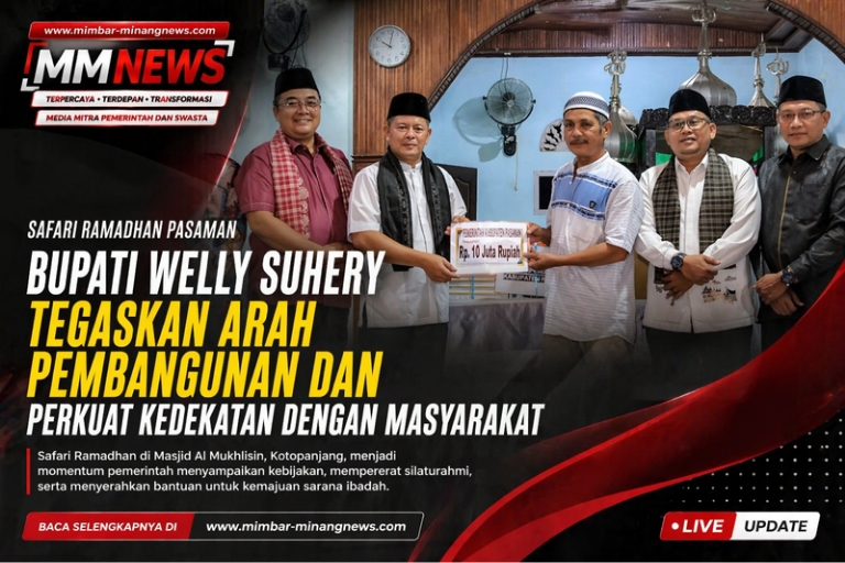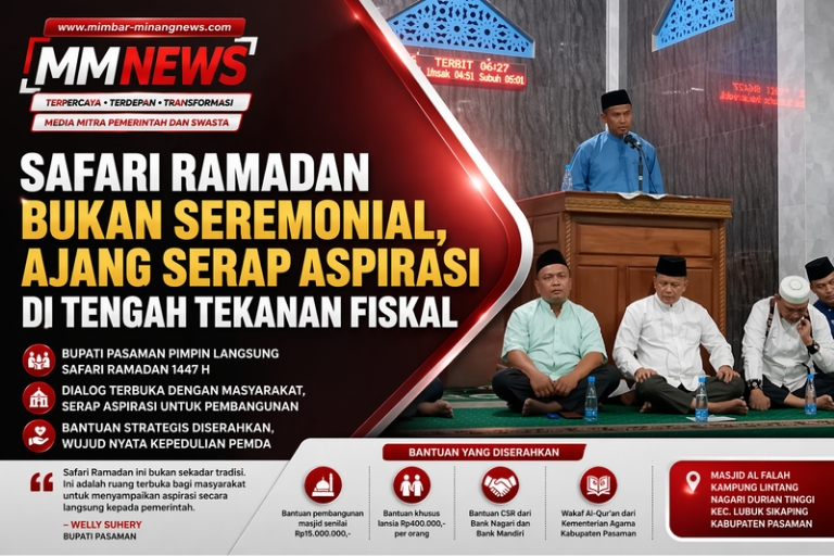 Pasaman, mimbar-minangnews.com — Pemerintah Kabupaten Pasaman mengawali rangkaian Safari Ramadan 1447 H dengan pendekatan yang lebih substantif: mendekatkan diri kepada masyarakat sekaligus menyerap aspirasi di tengah tantangan fiskal yang kian nyata. Kegiatan yang dipusatkan di Masjid Al Falah, Kampung Lintang, Nagari Durian Tinggi, Kecamatan Lubuk Sikaping ini dipimpin langsung oleh Bupati Pasaman, Welly Suhery. Momentum […]