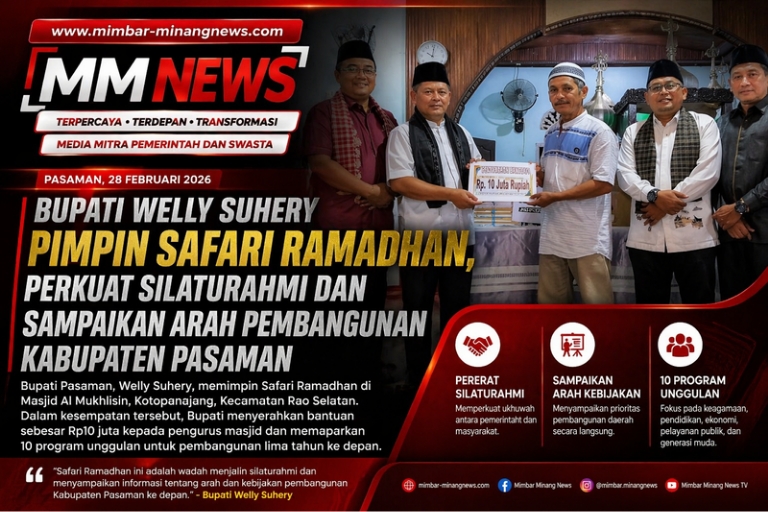Pasaman, mimbar-minangnews.com — Pemerintah Kabupaten Pasaman memanfaatkan momentum Safari Ramadhan sebagai ruang strategis untuk mempererat ukhuwah Islamiyah sekaligus memperkuat komunikasi langsung antara pemerintah dan masyarakat. Kegiatan yang dipimpin langsung oleh Bupati Pasaman, Welly Suhery, ini berlangsung di Masjid Al Mukhlisin, Kotopanjang, Nagari Lansek Kodok, Kecamatan Rao Selatan, Sabtu malam (28/2). Dalam kunjungan tersebut, Bupati Welly […]