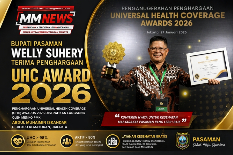 Pasaman, Mimbar-MinangNews.com — 27 Januari 2026 Komitmen kuat Pemerintah Kabupaten Pasaman dalam meningkatkan layanan kesehatan masyarakat membuahkan hasil membanggakan. Bupati Pasaman, Welly Suhery, berhasil meraih penghargaan Universal Health Coverage (UHC) Award 2026 yang diserahkan langsung oleh Abdul Muhaimin Iskandar di JIEXPO Kemayoran, Selasa (27/01/2026). Penghargaan tersebut diberikan sebagai bentuk apresiasi atas keberhasilan Kabupaten Pasaman dalam […]