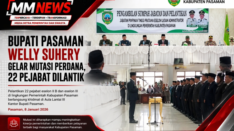 Pasaman, mimbar-minangnews.com — Bupati Pasaman, Welly Suhery, resmi menggelar mutasi perdana sejak menjabat dengan melantik dan mengambil sumpah jabatan 22 pejabat eselon II B dan eselon III di lingkungan Pemerintah Kabupaten Pasaman. Prosesi pelantikan berlangsung khidmat di Aula Lantai III Kantor Bupati Pasaman, Kamis (8/1/2026), dan dihadiri oleh Wakil Bupati Pasaman, Ketua DPRD, unsur Forkopimda, […]