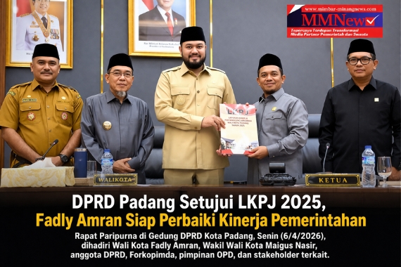 Padang, mimbar-minangnews.com – DPRD Kota Padang menyetujui Laporan Kinerja Pertanggungjawaban (LKPJ) Wali Kota Padang Tahun 2025 dalam Rapat Paripurna yang berlangsung di Gedung Utama DPRD Kota Padang, Kelurahan Sungai Sapih, Kecamatan Kuranji, Senin (6/4/2026). Rapat paripurna tersebut dipimpin Ketua DPRD Kota Padang, Muharlion, dan dihadiri Wali Kota Padang Fadly Amran, Wakil Wali Kota Maigus Nasir, […]