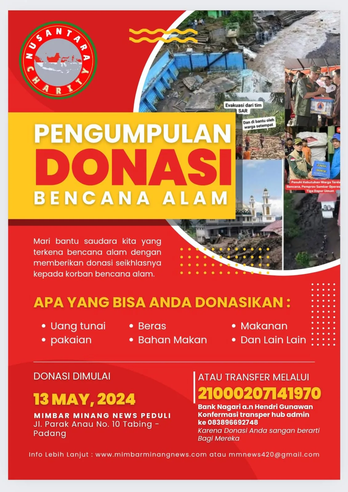 MMNews – Dini hari Ahad pukul 00.15 terjadi bencana Banjir bandang lahar dingin galodo dan tanah longsor di daerah Nagari Salingka Gunung Merapi Sumbar. Per hari ini tercatat sudah sampai 40 Korban Jiwa, dan masih ada yang hilang dan sedang dalam pencarian, putusnya jalan dan jembatan serta beberapa fasilitas umum terdampak membuat akses ke lokasi … Lanjutkan membaca Ayo Bantu Saudara Kita, Korban Dampak Banjir Bandang, Lahar Dingin, Galodo, Tanah Longsor, Tanah Datar dan Sekitarnya