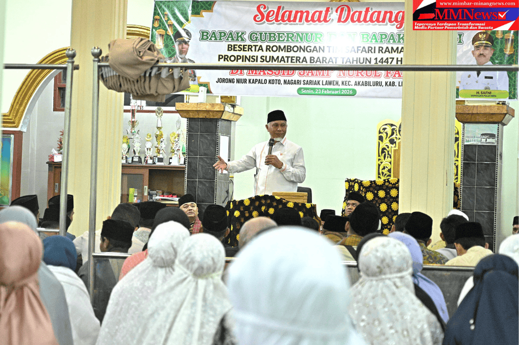 Lima Puluh Kota, Mimbar-MinangNews.com — Gubernur Sumatera Barat (Sumbar), Mahyeldi Ansharullah bersama rombongan Tim Safari Ramadan Provinsi Sumbar 1447 H/2026 M menyambangi Masjid Jami’ Nurul Falah, Jorong Niur Kapalo Koto, Nagari Sarik Laweh, Kecamatan Akabiluru, Kabupaten Lima Puluh Kota, Senin (23/2/2026). Dalam kunjungan tersebut, Gubernur Mahyeldi menyerahkan bantuan sebesar Rp50 juta, Bank Nagari Rp10 juta, […]