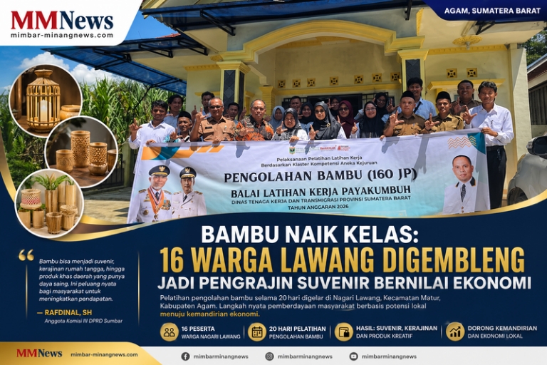 AGAM | mimbar-minangnews.com — Potensi bambu sebagai komoditas kreatif mulai mendapat perhatian serius di Nagari Lawang, Kecamatan Matur, Kabupaten Agam. Sebanyak 16 warga setempat mengikuti pelatihan intensif pengolahan bambu selama 20 hari guna menciptakan produk suvenir dan kerajinan bernilai jual tinggi.